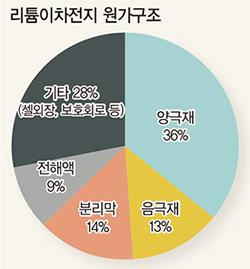2차전지 전체의 원가구조는 양극활물질 36%, 음극재 13%, 분리막 14%, 전해액은 13%를 차지합니다. 업체마다 제품 특성에 따라 오차를 가지고 있어 일반적인 구조입니다.
