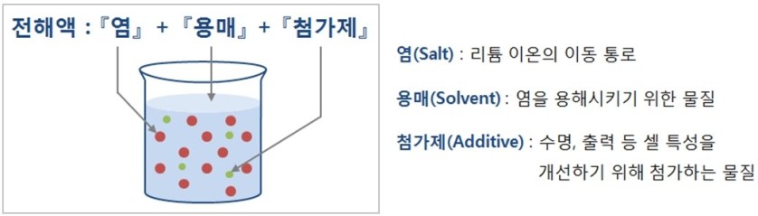 전해액은 염(Salt), 용매(Solvent), 첨가제(Additive)로 구성되어 있습니다.