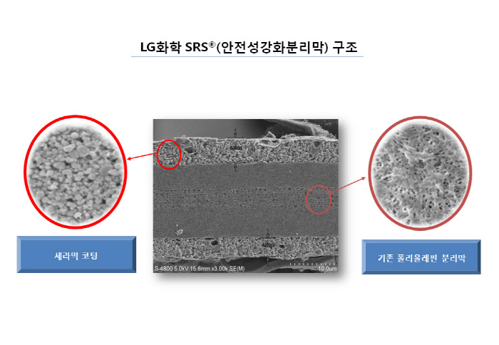 최근 주목받는 기술은 코팅방식 입니다. 코팅은 세라믹으로 하는 것, 폴리머로 하는 것, 컴바인으로 하는 3가지 종류가 있습니다. LG화학은 분리막 표면에 세라믹 입자와 고분자 바인더를 코팅하는 'Dip' 코팅 방식을 적용한 분리막을 리튬이온 이차전지 배터리에 적용했습니다. LG화학의 SRS 기술의 경우 나노 세라믹 코팅을 적용해 배터리의 내구성과 내열성을 강화하고 이온이 잘 통하는 다공성 폴리올레핀(PO) 소재로 배터리 내부의 전기적 단락을 감소시켜 줍니다. 이 기술은 특히 안전 문제가 중요한 전기차용 배터리에서의 경쟁력에 큰 영향을 줍니다.