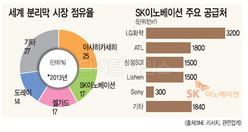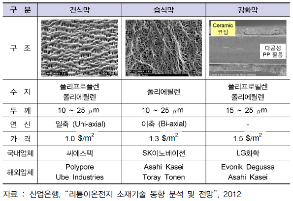 2013년 자료로 굉장히 옛날 자료입니다. 하지만 세계 분리막 시장은 여전히 비슷합니다. 최근 시장도 Entek, 아사히카세이(셀가드는 아사히에 합병됐습니다), SK이노베이션, 도레이가 메이저 기업입니다.