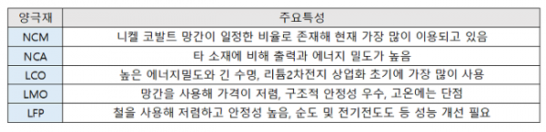 양극재 중요 원소 : 리튬(Li), 망간(Mn), 코발트(Co), 니켈(Ni), 알루미늄(AL)